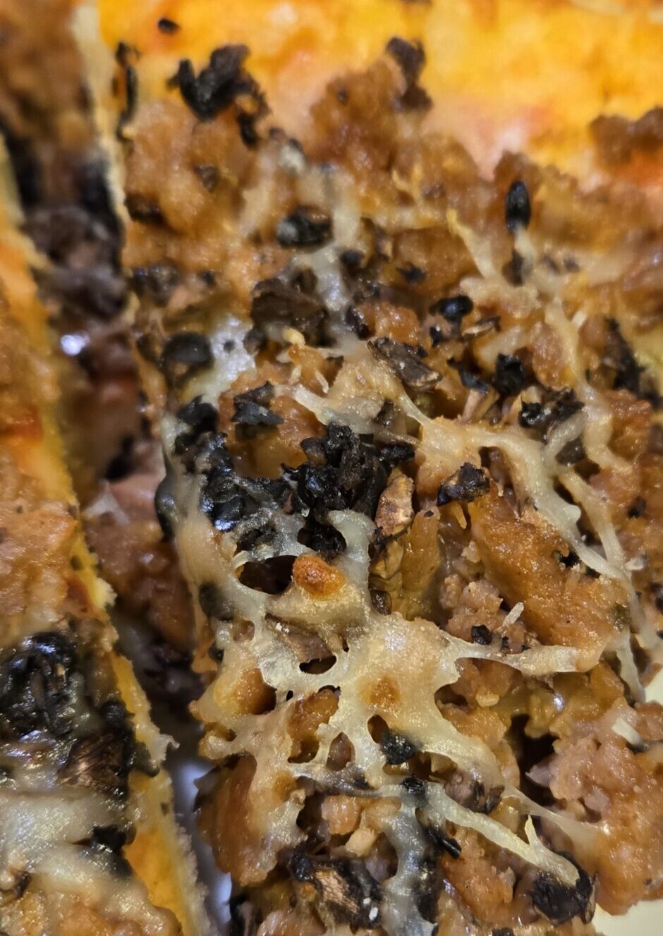 Crumbled local sausage, mushrooms and black olives